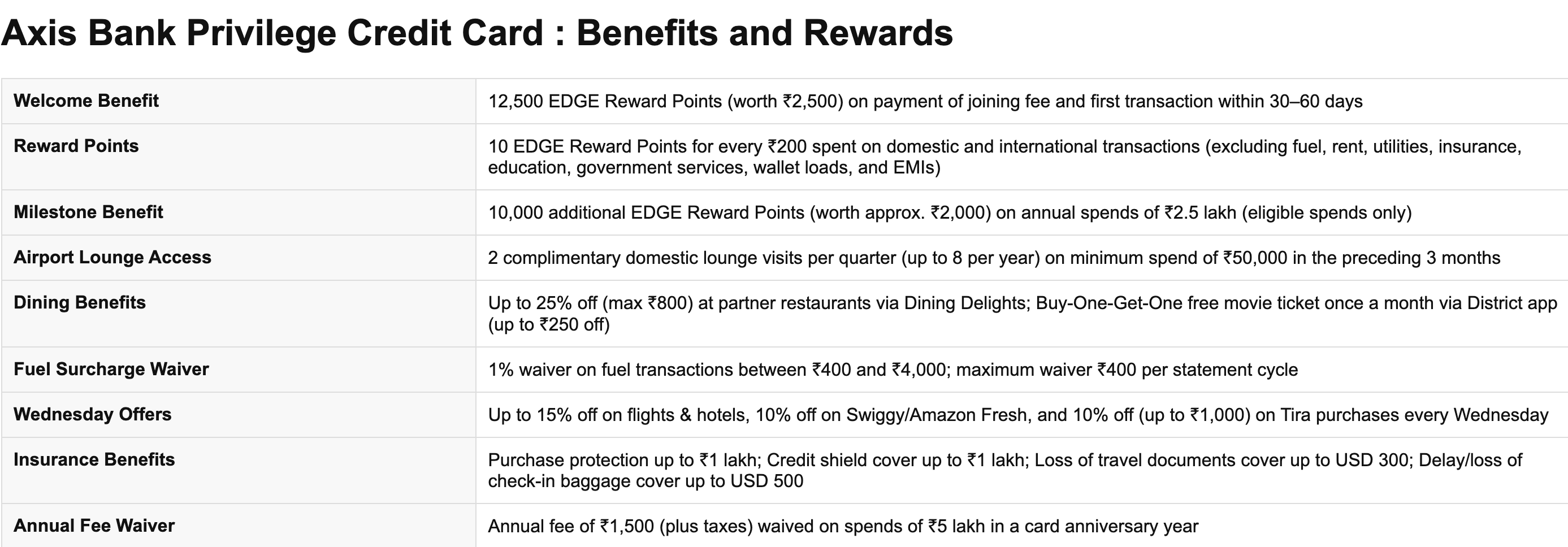 1. Welcome Benefit for Axis Bank Privilege Credit Card