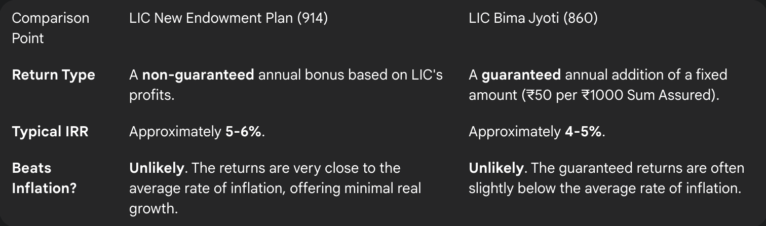 Neither the LIC New Endowment Plan nor the Bima Jyoti plan is likely to beat inflation in a significant way over the long term. Both are very safe savings instruments that provide returns typically close to or slightly below the average rate of inflation, meaning your money’s real growth will be minimal. They differ in how their returns are structured: one is variable, and the other is guaranteed.