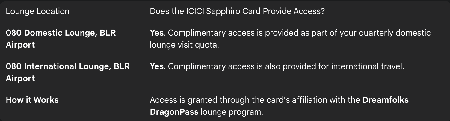 I was discussing this with my colleague who holds a Sapphiro card. She explained that the card provides lounge access through the Dreamfolks DragonPass Lounge Programme. Since the 080 Lounges at both Terminal 1 and Terminal 2 are part of this Dreamfolks network, the card works seamlessly for entry.