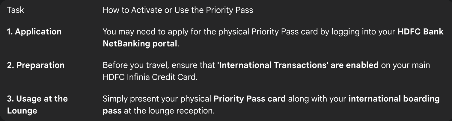 Activating and using the Priority Pass that comes with your HDFC Infinia card is a straightforward process. You typically need to apply for the pass through HDFC’s net banking, and once you receive the physical card, you simply present it at any participating international lounge for unlimited complimentary access.