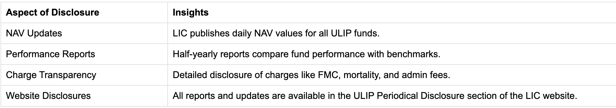 I came across a forum where someone explained that LIC provides detailed half-yearly disclosures of ULIP fund performance. These reports show how each fund is doing compared to its benchmark, which helps policyholders check if their money is managed efficiently.