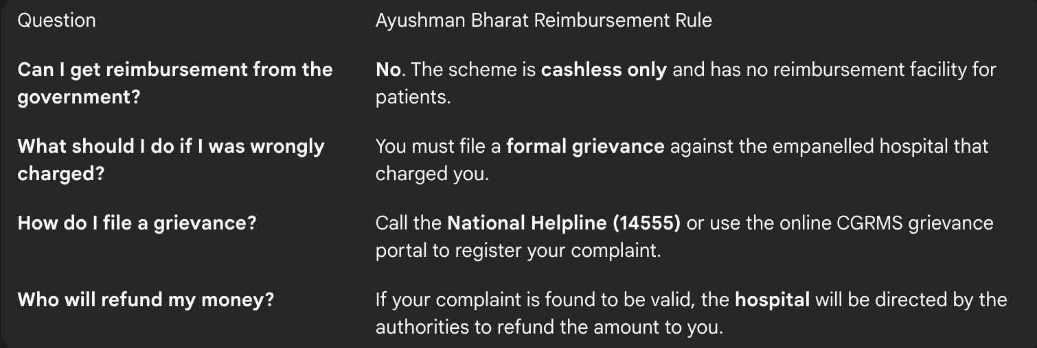 This is a very important point of clarification: the Ayushman Bharat (PM-JAY) scheme is cashless only and does not have a process for patient reimbursement. If an empanelled hospital has wrongly charged you for a covered treatment, you cannot claim the money back from the government. Your only recourse is to file a formal grievance against the hospital to get a refund from them.