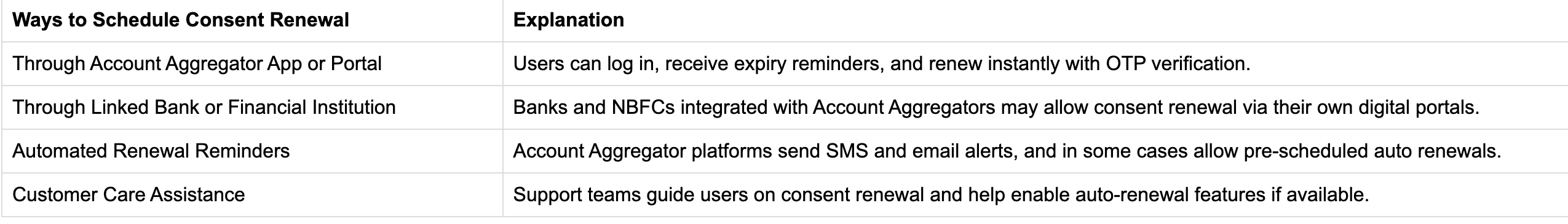 Manual Renewal: Users can manually renew their consent through the Account Aggregator’s app or portal.