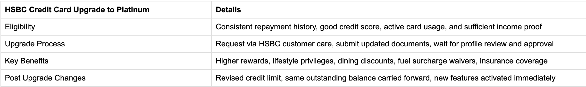 I have an HSBC credit card and was wondering how the upgrade process to HSBC Platinum works in India. What are the steps, eligibility, and benefits involved?