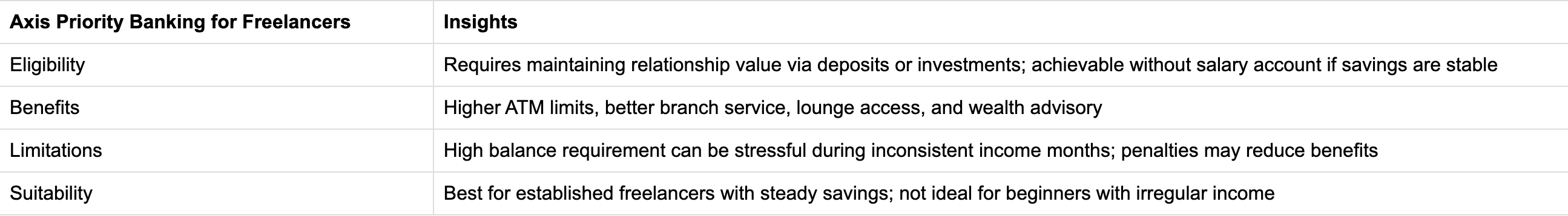 Axis Priority Banking is marketed as a premium banking service with exclusive benefits such as higher withdrawal limits, priority service at branches, and wealth management support. However, freelancers often face irregular cash flows, so evaluating whether the requirements and benefits align with freelance income patterns is important.