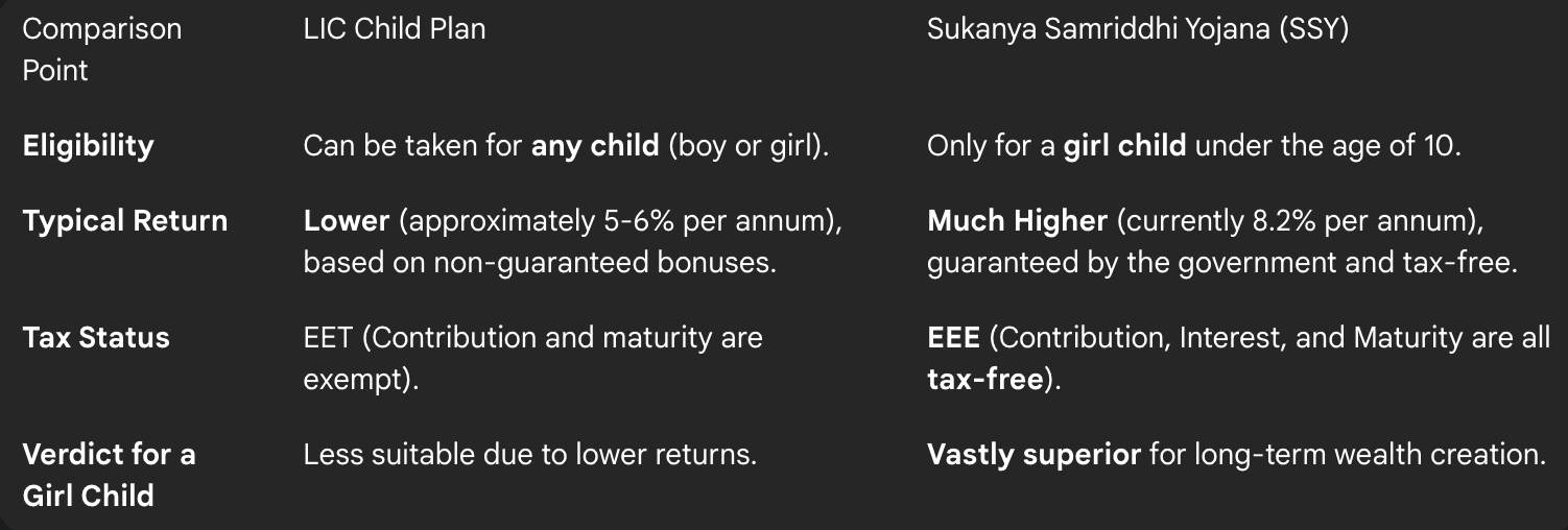 If you are saving for a girl child, the Sukanya Samriddhi Yojana (SSY) is a significantly better and more rewarding option than a traditional LIC child plan. The SSY is a government-backed scheme that offers a much higher, guaranteed, and tax-free interest rate, making it a superior tool for long-term wealth creation for a daughter.