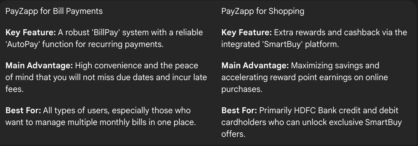 I was discussing this with a colleague, and we concluded that the “better” use case depends on the individual. For a user without an HDFC Bank card, PayZapp’s highly organized and reliable bill payment system is probably its most valuable feature. However, for an HDFC cardholder, the significant extra rewards earned via SmartBuy make it one of the most powerful shopping tools available.