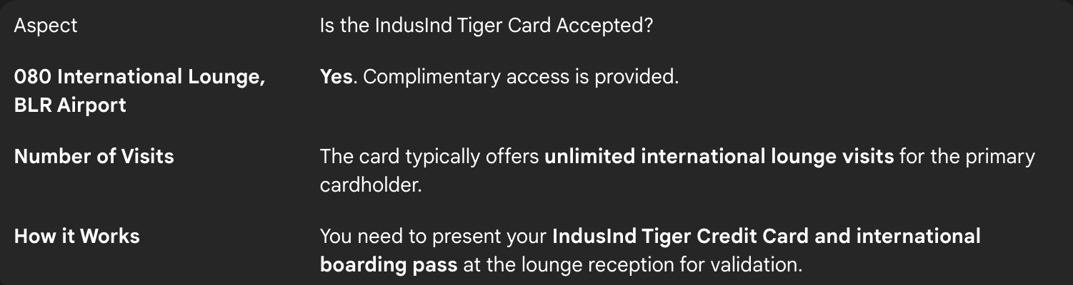 Yes, the IndusInd Tiger Credit Card is a premium travel card and it is accepted for complimentary access at the 080 International Lounge at Kempegowda International Airport (BLR) in Bengaluru. The card offers a generous lounge access program for both domestic and international travel.