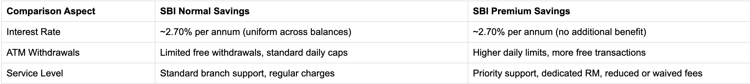 A friend recently upgraded to SBI Premium expecting better interest on his balance. He was surprised to find that the account still earned the same 2.70% per annum as his previous account. The main benefits of the Premium variant were higher withdrawal limits, reduced penalties for missed minimum balances, and faster service for queries, rather than additional interest on deposits.