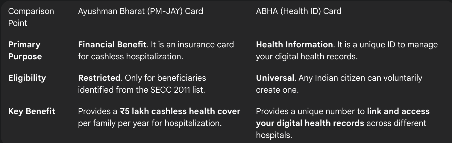 I was explaining this to my neighbor to clear his confusion. I told him to think of his Ayushman Bharat (PM-JAY) card as his insurance policy card. He uses it only when he needs to claim the ₹5 lakh cashless treatment benefit during a hospital admission. His ABHA card, on the other hand, is like a unique digital file number for his health. It’s an ID used to store and link all his medical reports, prescriptions, and discharge summaries in one secure place online.