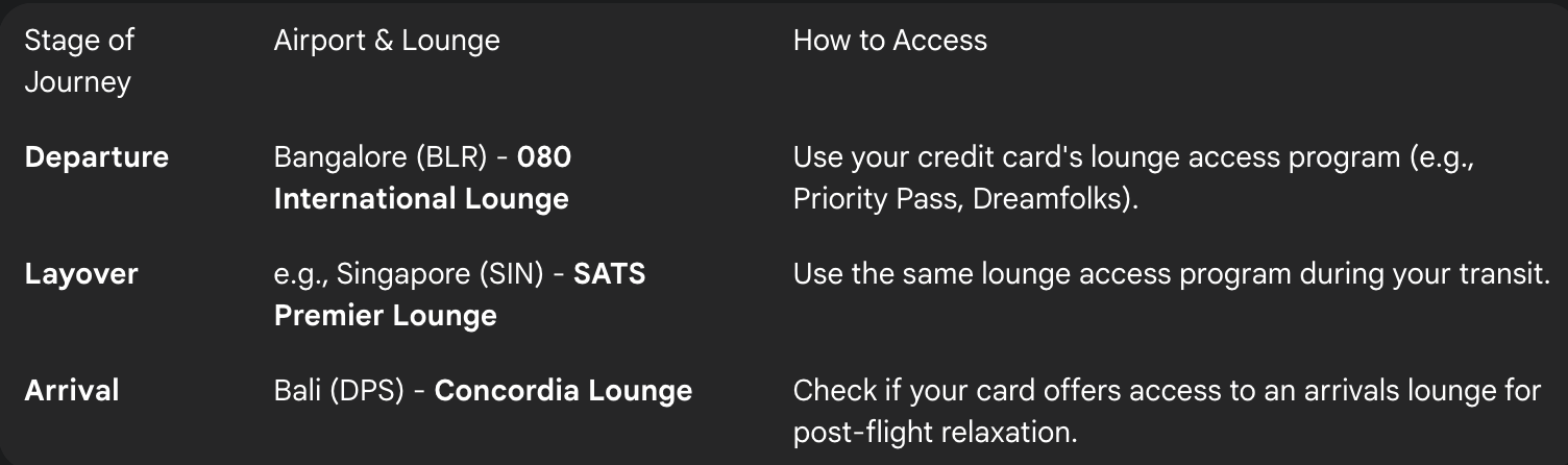 A good lounge access strategy for a trip from Bangalore to Bali involves using lounges at three key points: at your departure from Bangalore, during any potential layover, and upon arrival in Bali. While departure and layover lounges are common, arrival lounges are rarer but can be very useful.