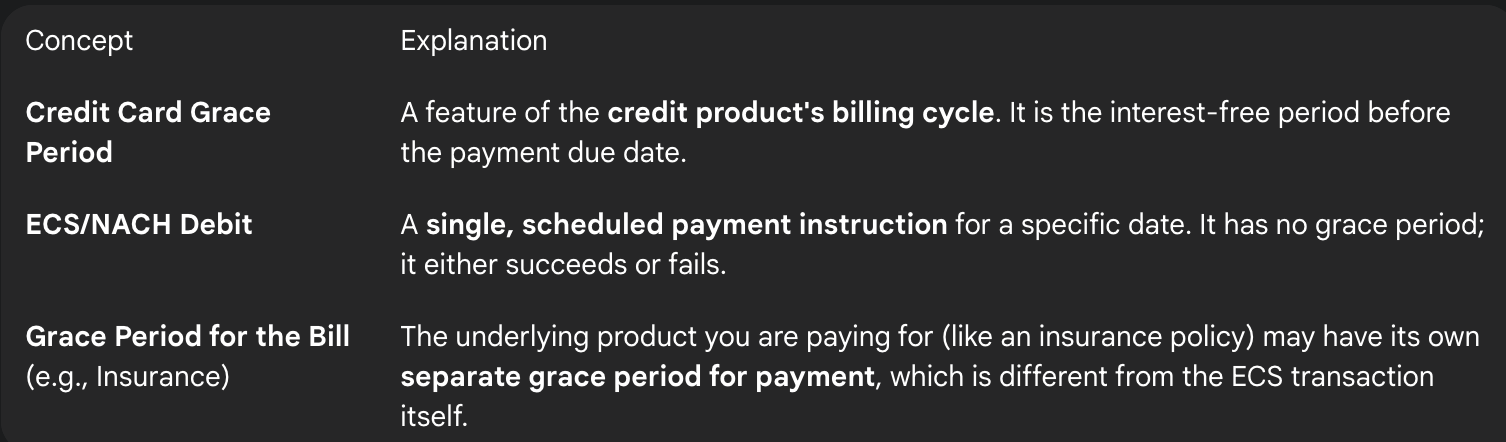 This is a common point of confusion that arises from two very different financial concepts. The “grace period” on a credit card is a feature of its billing cycle, whereas an ECS debit is a one-time payment instruction. There is no grace period for the ECS transaction itself, although the underlying bill you are paying might have its own separate grace period.